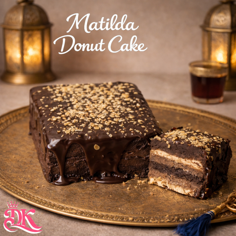 For true chocolate lovers, our Matilda Donut Cake is pure indulgence in every layer. It begins with a soft, fluffy donut, topped with silky chocolate ganache and a rich, moist fudge cake. Finished with another donut layer, generously coated in smooth ganache, then crowned with glossy chocolate sauce and crispy feuilletine for the perfect crunch. Decadent, bold, and irresistibly satisfying — a show-stopping dessert for your Ramadan gatherings.